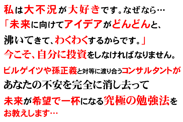 私がこの30年間、ひたすら秘密にしてきた貴重な方法、どん底だった私の人生を変えた本当に結果のでるテクニックやノウハウを安く提供するつもりはありませんでした。当然です、この方法をつかって一流の会社のコンサルタントをしているのですから。最初は39800円で公開しようと考えていました。