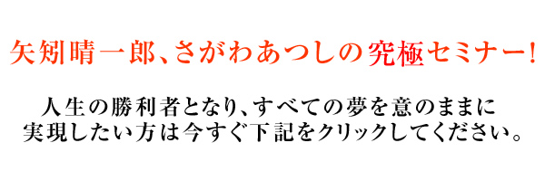 あなたは私が歩んできた苦労をする必要はありません。私が78年かけて得た成功をもっと早く、掴んでもらいたいのです。このセミナーでは、私にもし跡を継ぐ息子がいたら、私が死ぬ前に絶対に教えておきたいと思えるほど重要、真剣な内容をそのまま公開します。私はあなたに全てを引き継ぎます。矢矧とさがわを信じる。という決断をしてくれるでしょうか?…
